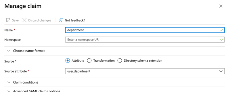 For example, here are the Manage claim settings for the optional department claim: