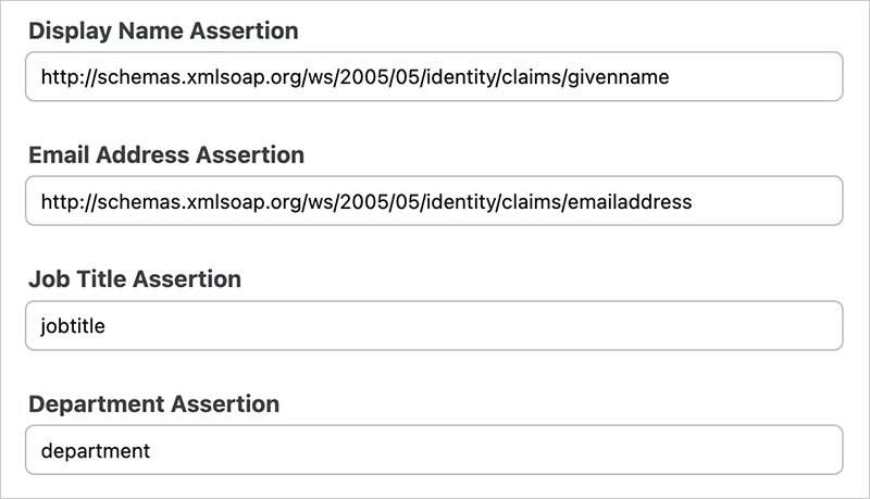 The default Entra ID given name assertion is http://schemas.xmlsoap.org/ws/2005/05/identity/claims/givenname. You can confirm this value on your Entra ID attributes list.Email Address Assertion The default Entra ID email assertion is http://schemas.xmlsoap.org/ws/2005/05/identity/claims/emailaddress. You can confirm this value on your Entra ID attributes list.