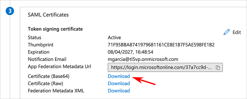 Copy the Federation Metadata URL from the Entra ID SAML Certificates page.