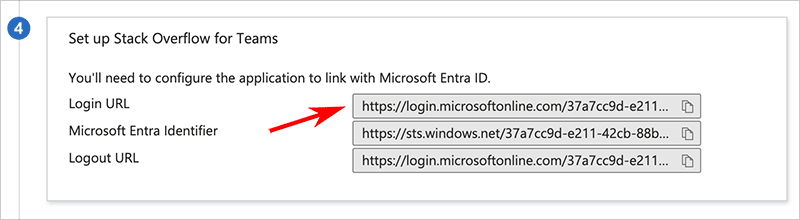 Copy the Login URL from Entra ID setup step 4. You'll paste this as the Single Sign-On Service URL value in your Stack Overflow Internal authentication settings.