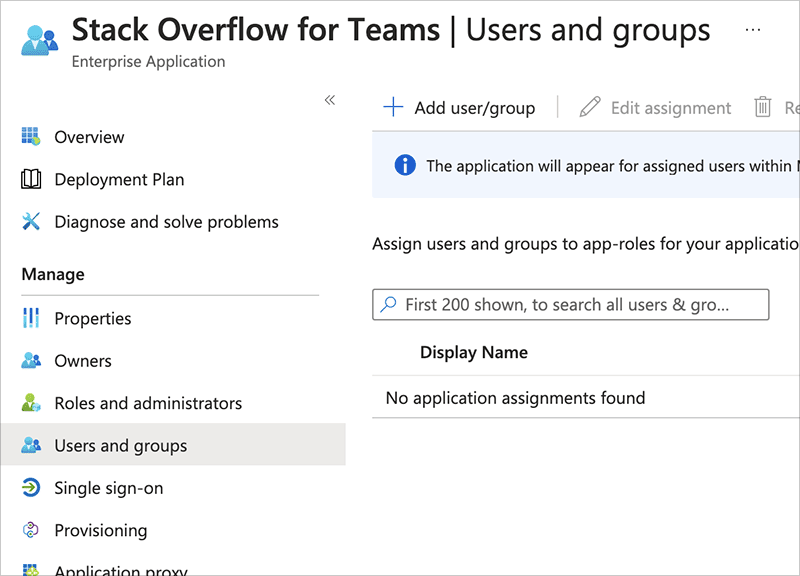 In Entra ID, you'll need to add users and/or groups. To do this, click Users and groups in the left-hand menu, then Add user/group.