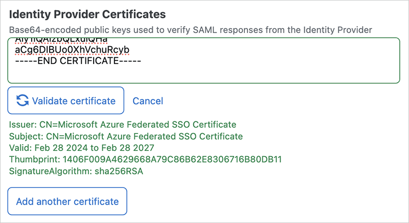 Copy and paste the contents of that file into the Identity Provider Certificates box. Be sure to include "-----BEGIN CERTIFICATE-----", the certificate itself, and "-----END CERTIFICATE-----".
