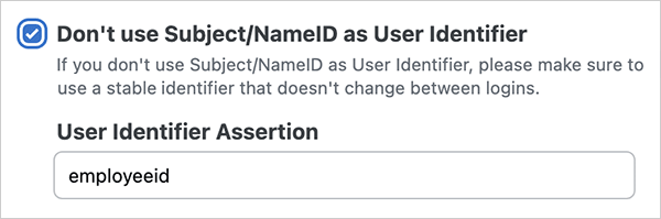 If you check the Don't use Subject/NameID as User Identifier checkbox, you can specify a different user identifier assertion. If you choose a different user identifier, make sure it's an unchanging, unique identifier that remains consistent across logins.