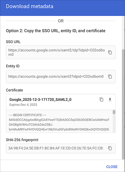 In Google, click DOWNLOAD METADATA to retrieve configuration values. You don’t need to download the file. Instead, you'll copy and paste the information into your Stack Overflow Internal site.