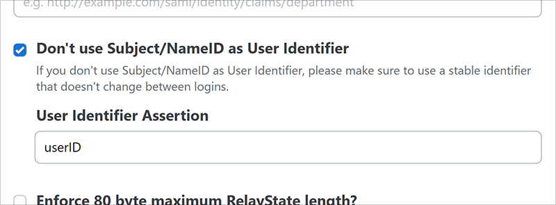 Don't use Subject/NameID as User Identifier is unchecked by default. The default unchecked setting allows the IdP to specify the user identifier based on your SAML app configuration. This is the recommended setting.