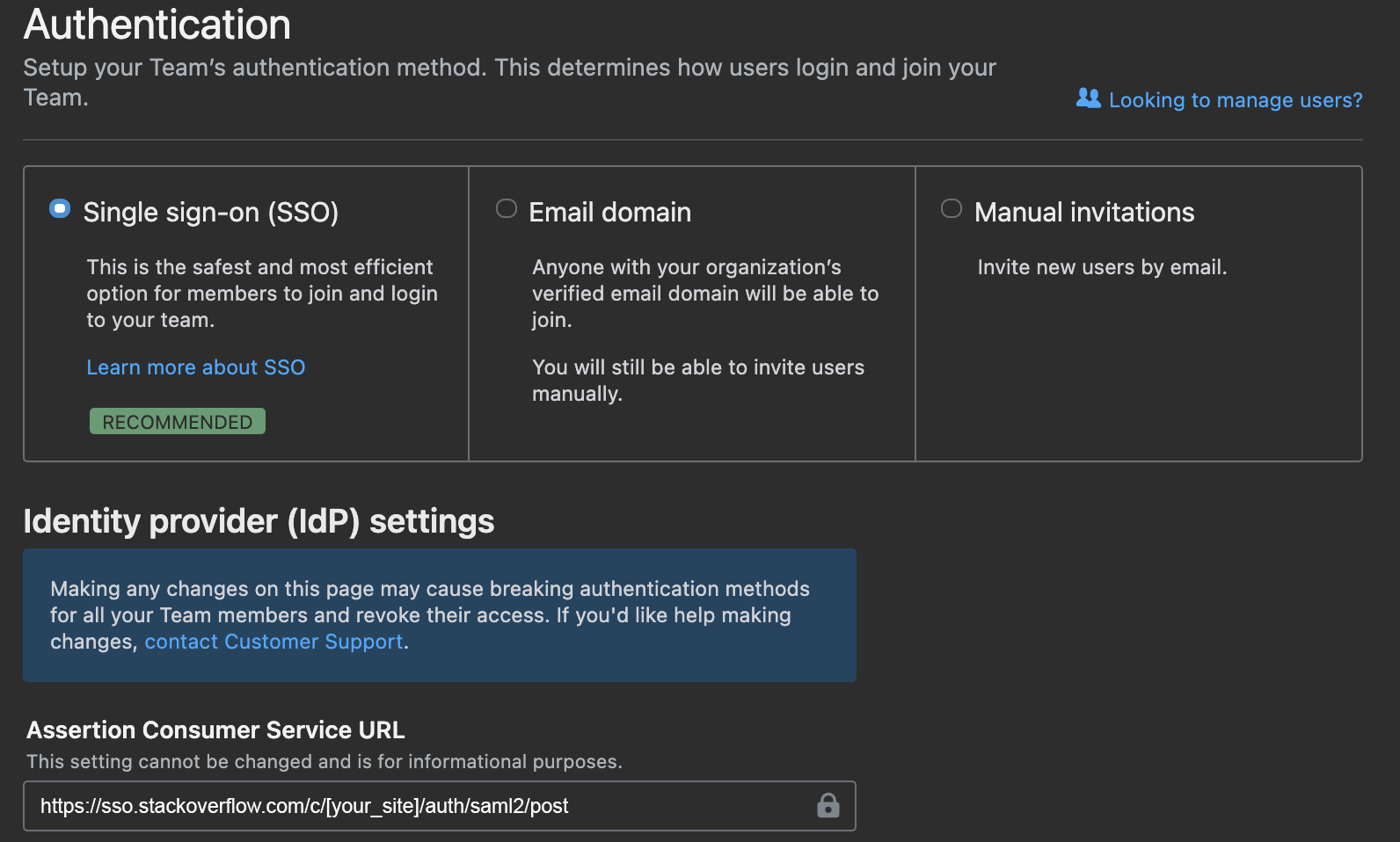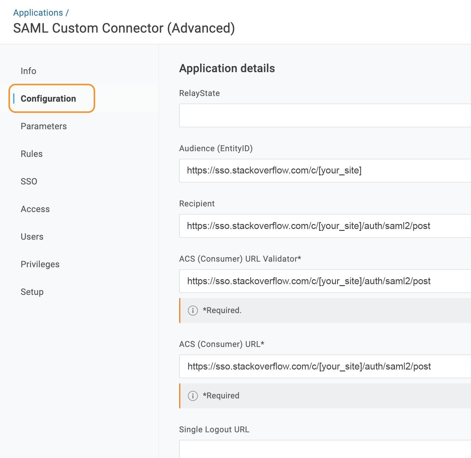 - ACS (Consumer) URL & ACS (Consumer) URL Validator: This is the Assertion Consumer Service URL of your Team, which can be found on https://stackoverflowteams.com/c/[your_site]/admin/access/authentication