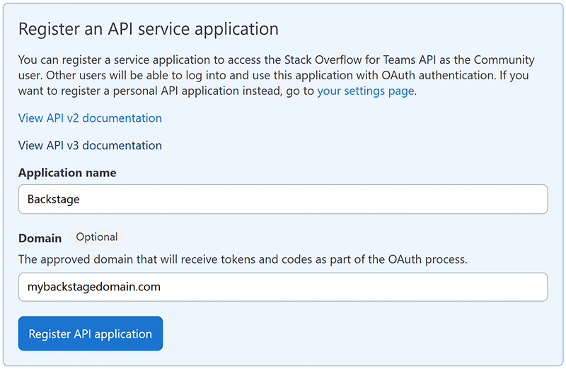 To connect your Stack Internal Enterprise site to the Backstage integration, the best approach is for a Stack Overflow administrator to create a service application. Learn more about API applications and Stack Overflow Internal service applications in the Stack Overflow Internal API v3 article.