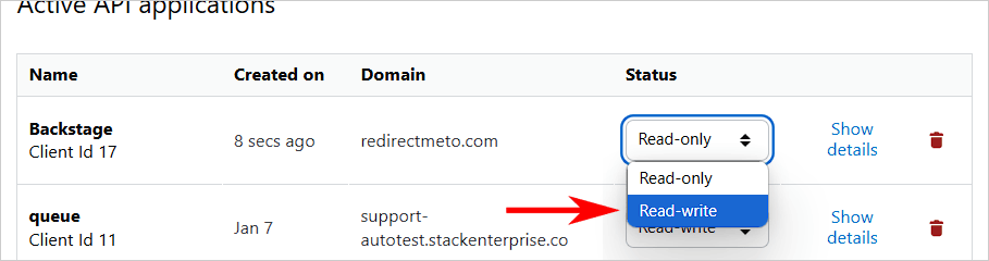Once you've created the service application, refresh the page, change its Status to read-write, and click Confirm. Backstage will need the client_id, so be sure to save it to your working document.