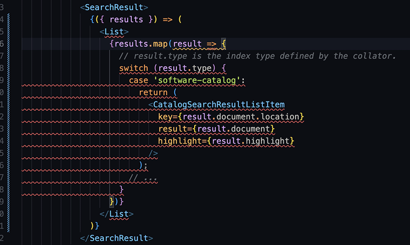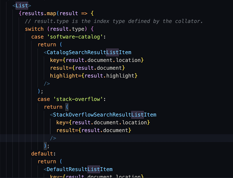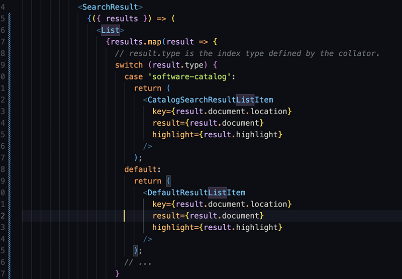 By default, SearchPage.tsx displays the search results without conditional formatting. You'll modify this to let the type of returned search results control how the search results appear.