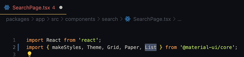 <List/>component from the Material UI library by adding it to the@material-ui/coreimport array: