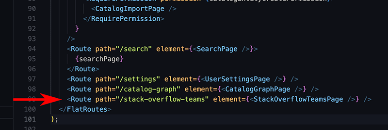 App.tsxfile, usually found atpackages/frontend/src. Scroll until you see the<Route />elements. Add a route for the StackOverflowTeamsPage component as follows: