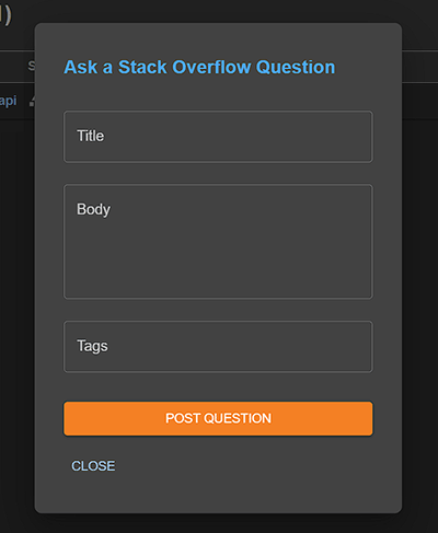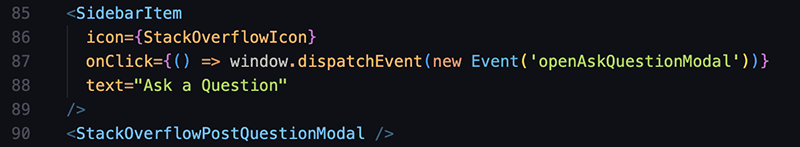<StackOverflowPostQuestionModal />listens to the event "openAskQuestionModal" regardless of where the event is created. Add a newSidebarItemto create that event, and also add the<StackOverflowPostQuestionModal />as seen below: