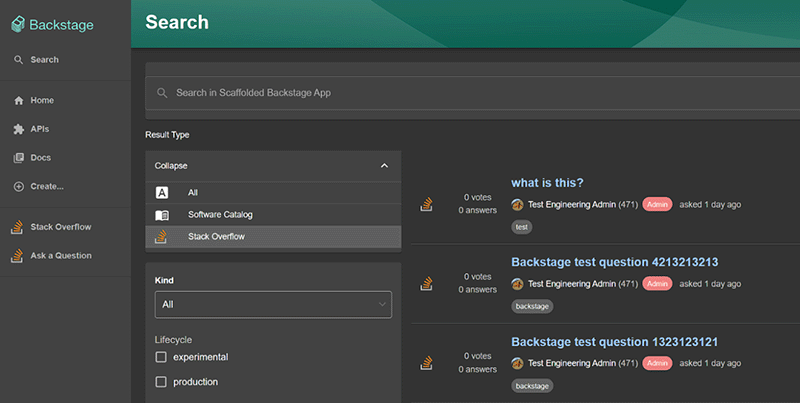 Backstage.io is a developer portal that streamlines software development by providing developers a common repository of code, libraries, documentation, and other resources. You can connect Backstage to your Stack Internal Basic, Business, or Enterprise site to display questions, tags, and users, as well as ask questions from your Backstage application.