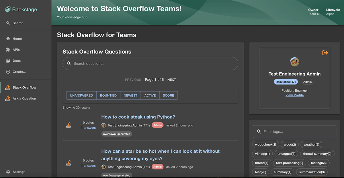 - Contextual insights Embeddable UI components bring vital Stack Overflow information directly into your Backstage environment.