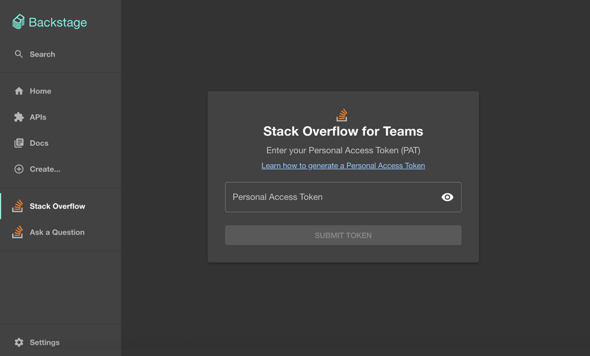Stack Internal Basic and Business users will need to generate an access token by following the steps in the Personal Access Tokens (PATs) for API Authentication article. At the login screen, paste the PAT and click SUBMIT TOKEN. Backstage will store and use the token for subsequent logins.