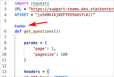 NOTE: Before you can use the Explain Code feature, you must first install the Stack Overflow Internal Visual Studio Code extension by following these instructions. Your Stack Overflow site must also have Unified Search enabled.
