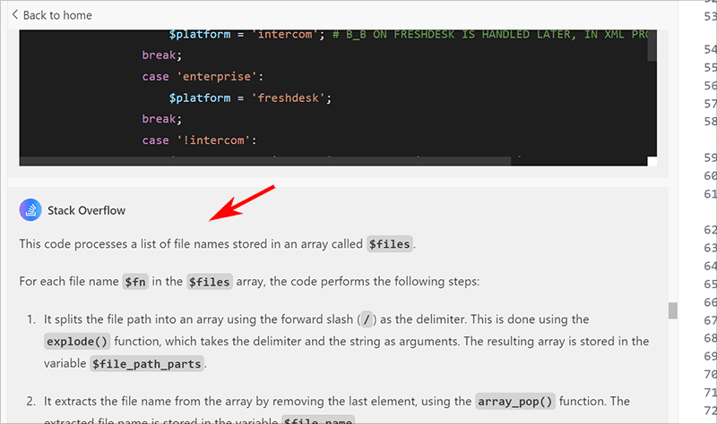 After you start the code explanation process, the IDE extension searches Stack Overflow for relevant discussions, answers, and explanations related to the code. It then uses AI to generate a concise, accurate explanation of the code. You'll see the code explanation in VSC's left-hand column.