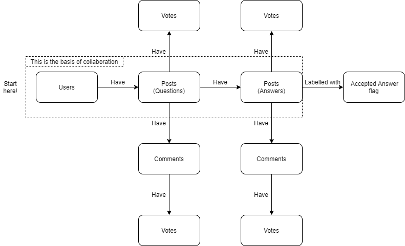 The graphic below shows the relationship of the data inside Stack Overflow's Q&A model: