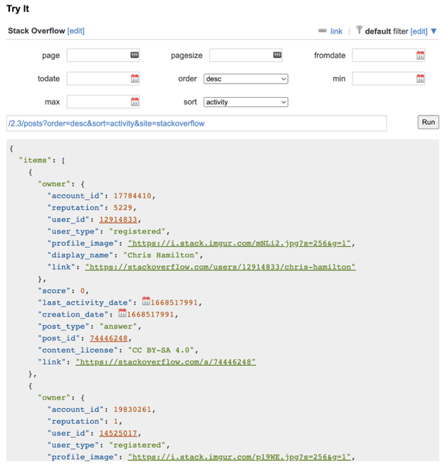 In the Stack Overflow data model, questions and answers are both considered posts. To pull sample post data from the API, click Run.