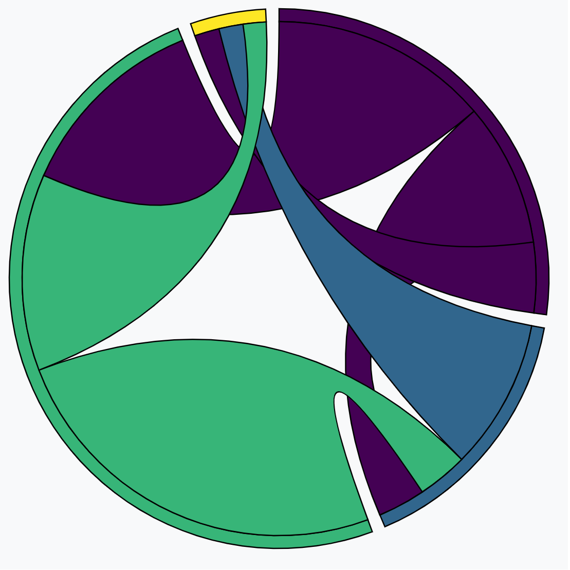 In the example below, the outer band is a colored pie chart showing the proportion of questions asked by department or location. The flow across the diagram shows which department answered the questions. This example shows that the yellow group answered the majority of the blue group's questions.