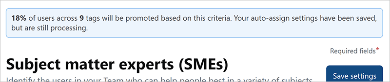 • After you enable SME auto-assign, it may take as long as 10 minutes for the automation to assign SME statuses. When the automation finishes, you'll receive a confirmation to your For You inbox and email (if enabled).