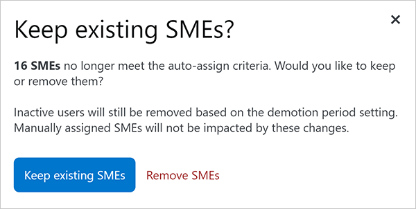 The SME Auto-Assign feature will remove SME status from users who've been inactive for a specified period of time. When the automation removes a user's SME status, they'll see an alert on their home page.