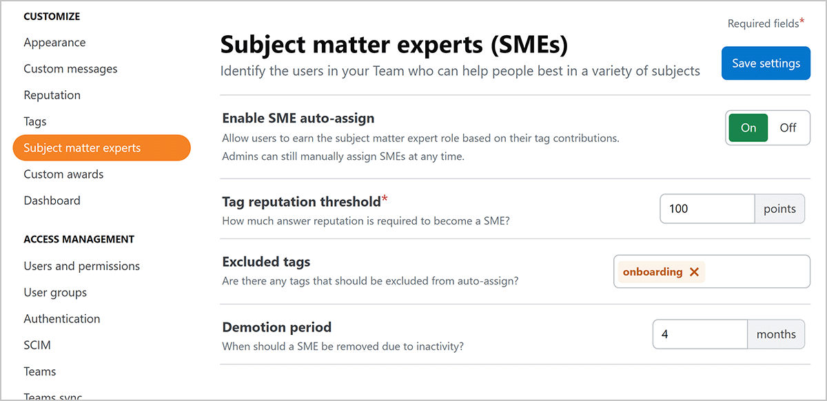 - Tag reputation threshold (required) Set the tag reputation threshold at which the site should consider a user an SME for that tag. The default value is 100. You can change this setting at any time, and the automation will assign SMEs based on the new value.