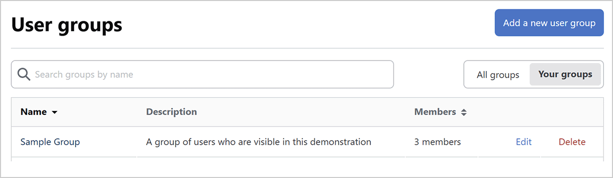 Like a site administrator, Stack Internal Enterprise moderators are able to manage user groups by clicking Users in the left-hand menu, then user groups. Moderators can then Edit or Delete an existing group, or Add a new user group.