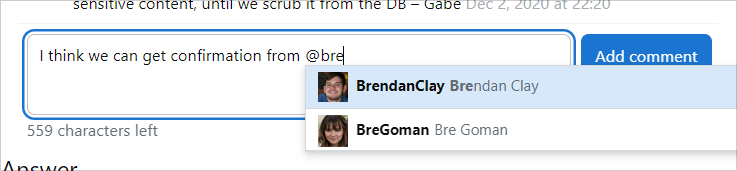 Click a username from the suggestion list to select it and automatically fill out the @username tag. When you save the comment, Stack Overflow Internal will alert specified users with a link to the comment.