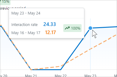 Several of the dashboard charts will show statistics that compare the selected date range to a previous date range of the same duration.