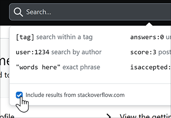 To enable Unified Search, place your cursor in the Search box at the top of the page. A box appears with search tips and an Include results from stackoverflow.com (Unified Search) checkbox.