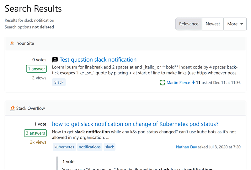 Stack Internal Enterprise's Unified Search feature allows you to search and access knowledge from your private Stack Overflow Internal site and the public Stack Overflow site at the same time. This gives you the benefits of private and public content in the same search, saving time and greatly increasing the quantity of information at your fingertips.