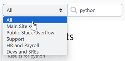 If you choose All, Stack Internal Enterprise will search your main site plus all Private Teams you're a part of. All does not include the public Stack Overflow site unless you also check the Include results from stackoverflow.com checkbox.