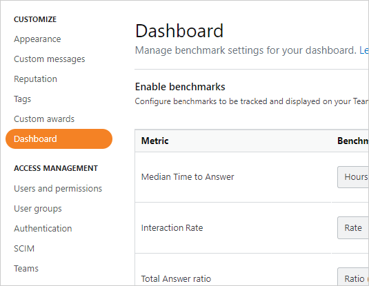 Stack Internal Enterprise shows user engagement in an info-packed dashboard with date range comparison, benchmarks, tag filtering, and more. Stack Internal Enterprise has admin settings that allow you to specify benchmark values (goals) for several aspects of your site's user engagement. The dashboard will then display those benchmarks in the charts to help you visualize your site's progress toward those goals.