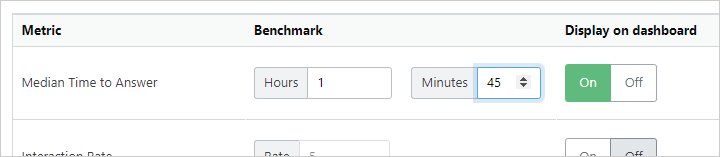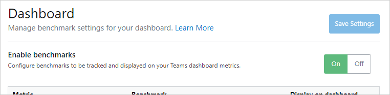 The dashboard settings page lists several benchmarks you can define and display on the corresponding dashboard charts. These metrics include: