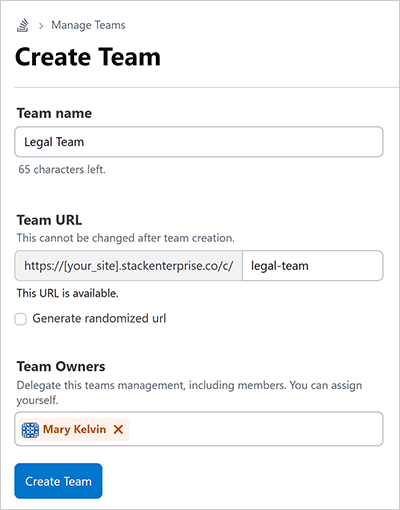 To create a Private Team, fill in the Team name and Team URL fields. The site admin will also need to add at least one team owner in the Team Owners field.