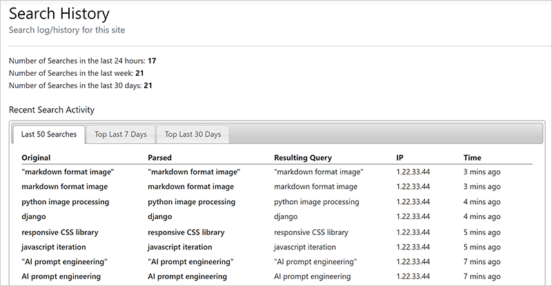 - Last 50 Searches The last 50 searches, ordered from most recent to oldest.