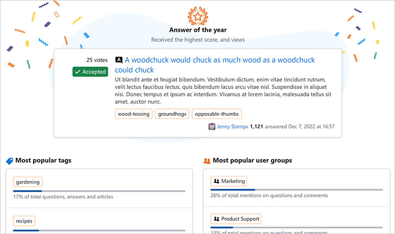 Stack Internal Enterprise includes a Your [year] Stacked page to celebrate your users' contributions and community impact over the previous calendar year. This Stacked retrospective page goes beyond the dashboard to highlight a year's worth of achievements in a visually engaging way.