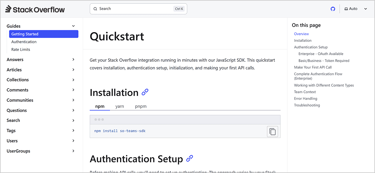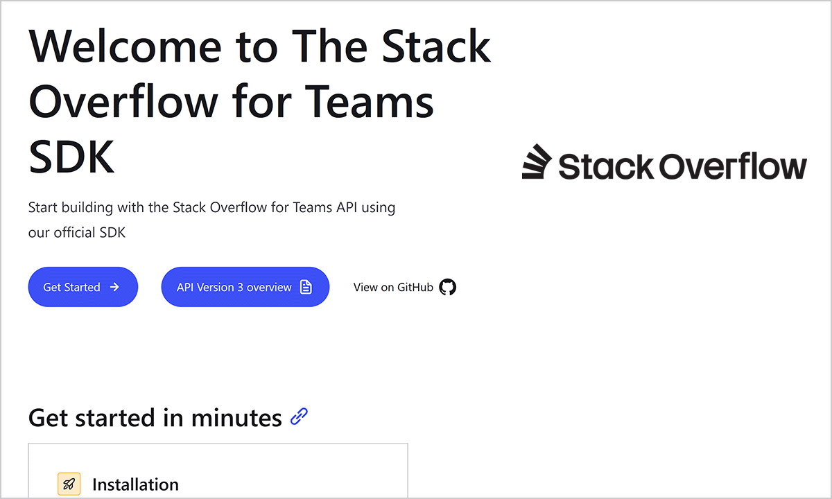 The Stack Overflow Internal software development kit (SDK) offers efficient, standardized access to our API version 3. With official support and complete TypeScript definitions, the SDK enables organizations to accelerate integrations, create custom applications, and connect their Stack Internal Basic, Business, or Enterprise site with existing workflows.