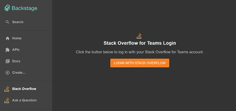 If you're using Stack Internal Enterprise, you’ll see a "Stack Overflow Internal Login" prompt. Click LOGIN WITH STACK OVERFLOW. Backstage will sign you in automatically with OAuth, no token required.