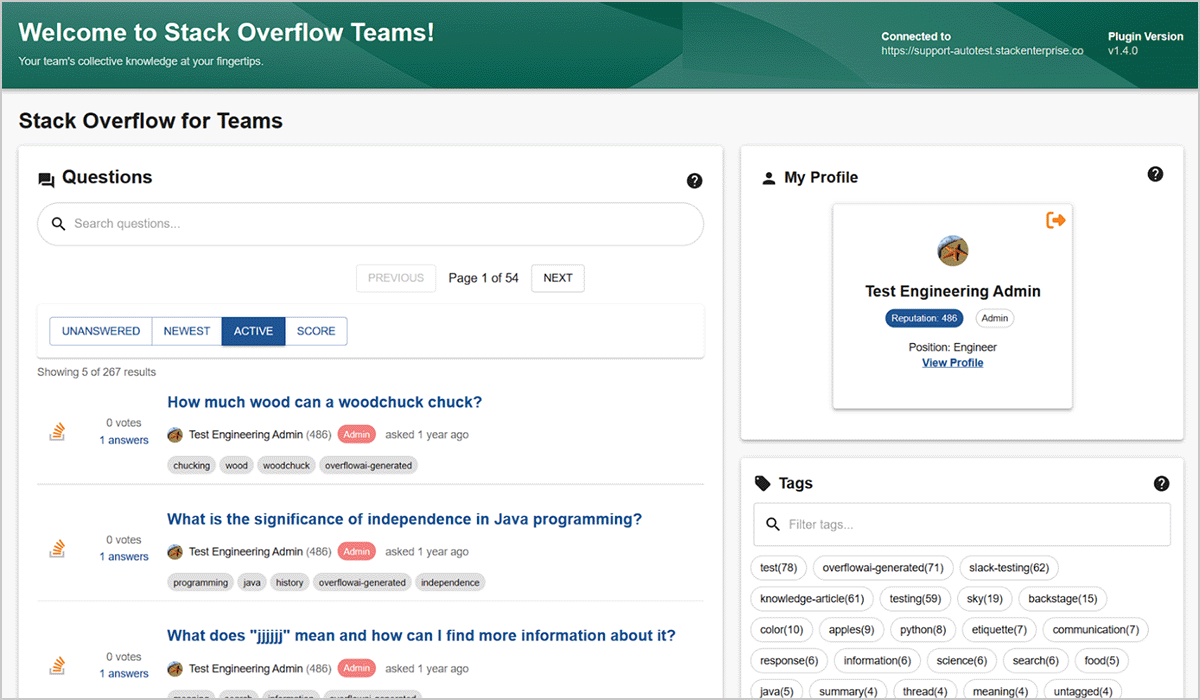The Stack Overflow Hub brings key functions of your Stack Overflow Internal site directly into Backstage. These include: