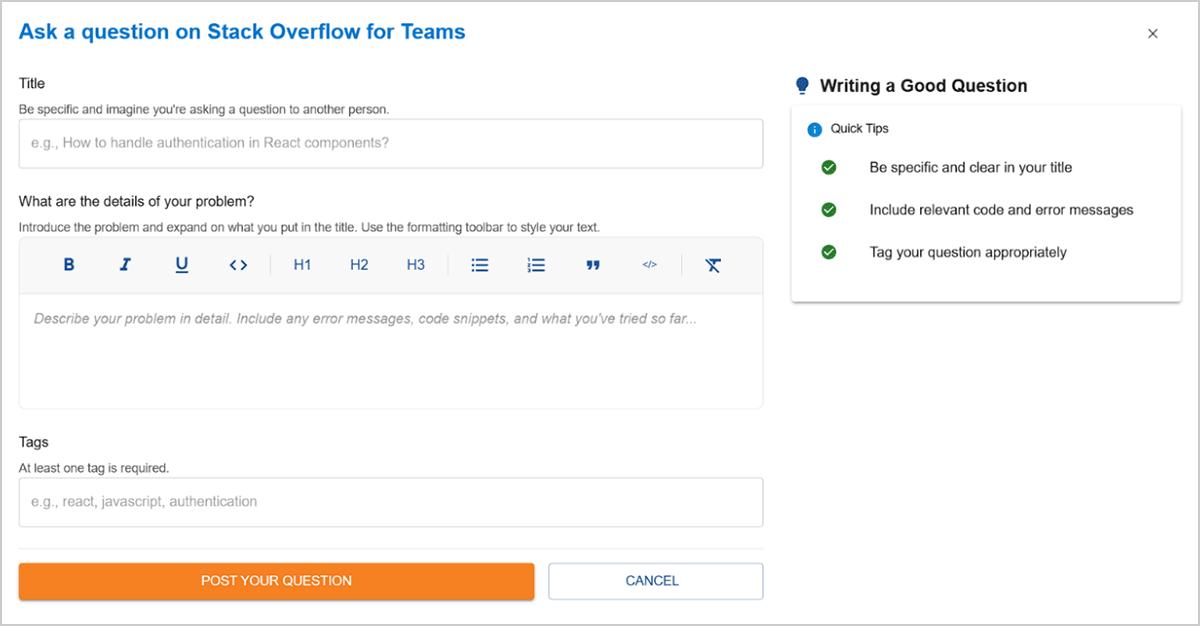 Once you're logged in, you can post a question to your Stack Overflow Internal site without ever leaving the page you’re on. Just click Ask a Question on the sidebar (look for the Stack Overflow logo).