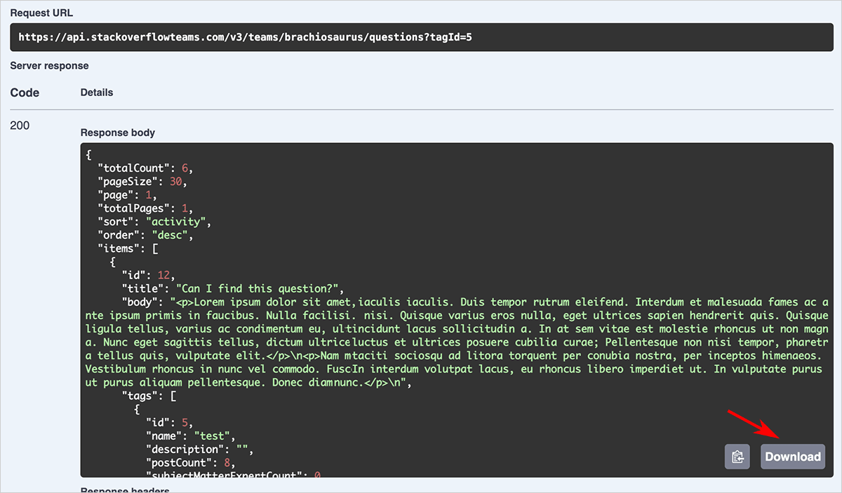 To save the data as a JSON file using Swagger UI on your Stack Overflow Internal site, press the Download button.