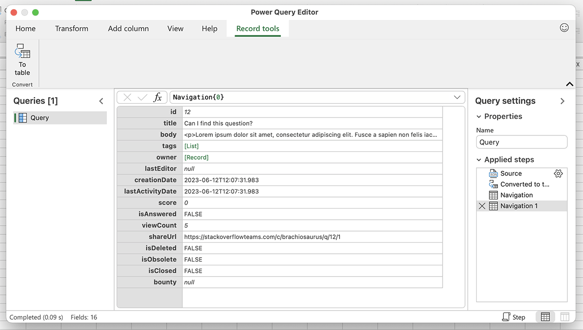 Power Query Editor will open, showing the data returned by the API. Click into the Record or List to navigate through the data structure and find the elements you wish to include in the spreadsheet.