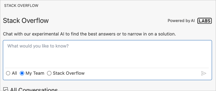 Click the Stack Overflow logo to switch to the extension. Type your question or search terms into the extension's chat box. Use the radio buttons to instruct the extension where to search. Search options include:
