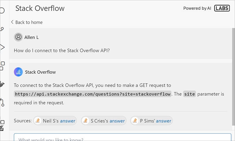 After you enter your question in the chat box, the Stack Overflow extension will analyze the search results it finds and compose a reply with citations.