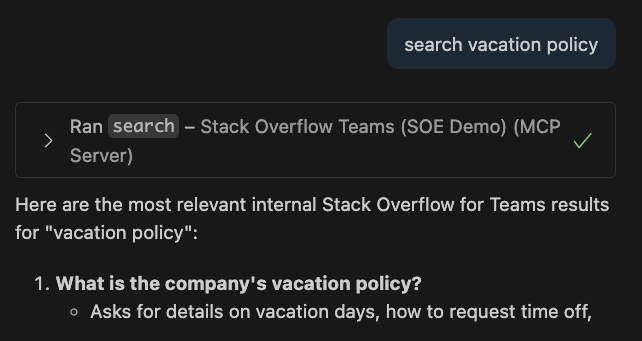 The Stack Overflow Internal MCP server makes your enterprise knowledge available to any MCP-compatible AI agent. To learn more about configuring and accessing the Stack Internal Enterprise MCP server, read the MCP Server Quickstart Guide.