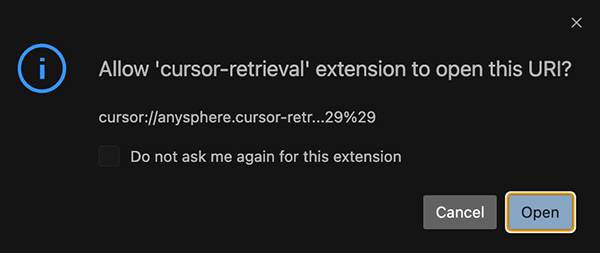 After successful authentication, Cursor will ask you to grant permission to the ‘cursor-retrieval’ extension. Click Open.