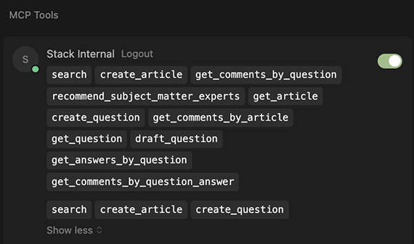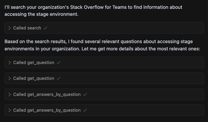 The Stack Overflow Internal MCP server makes your enterprise knowledge available to any MCP-compatible AI agent. To learn more about configuring and accessing the Stack Internal Enterprise MCP server, read the MCP Server Quickstart Guide.