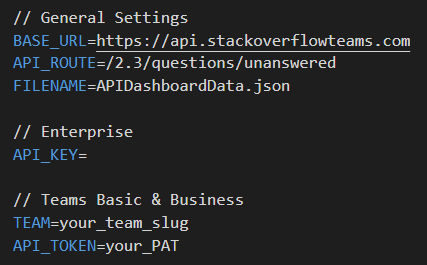 You'll set the API_Route variable to /2.3/questions/unanswered in this example to pull the number of unanswered questions. You could pull different data by changing the API_Route variable in the .env config file (see Install and configure the Node.js application above). Learn more about the available API routes at https://api.stackoverflowteams.com/docs.